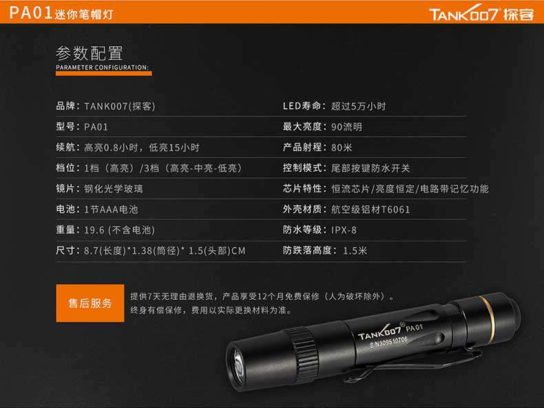 1.PA01是一款便攜式迷你筆帽燈,僅使用一節AAA電池,手指般大小,筒身滴水紋設計,美觀大方。
